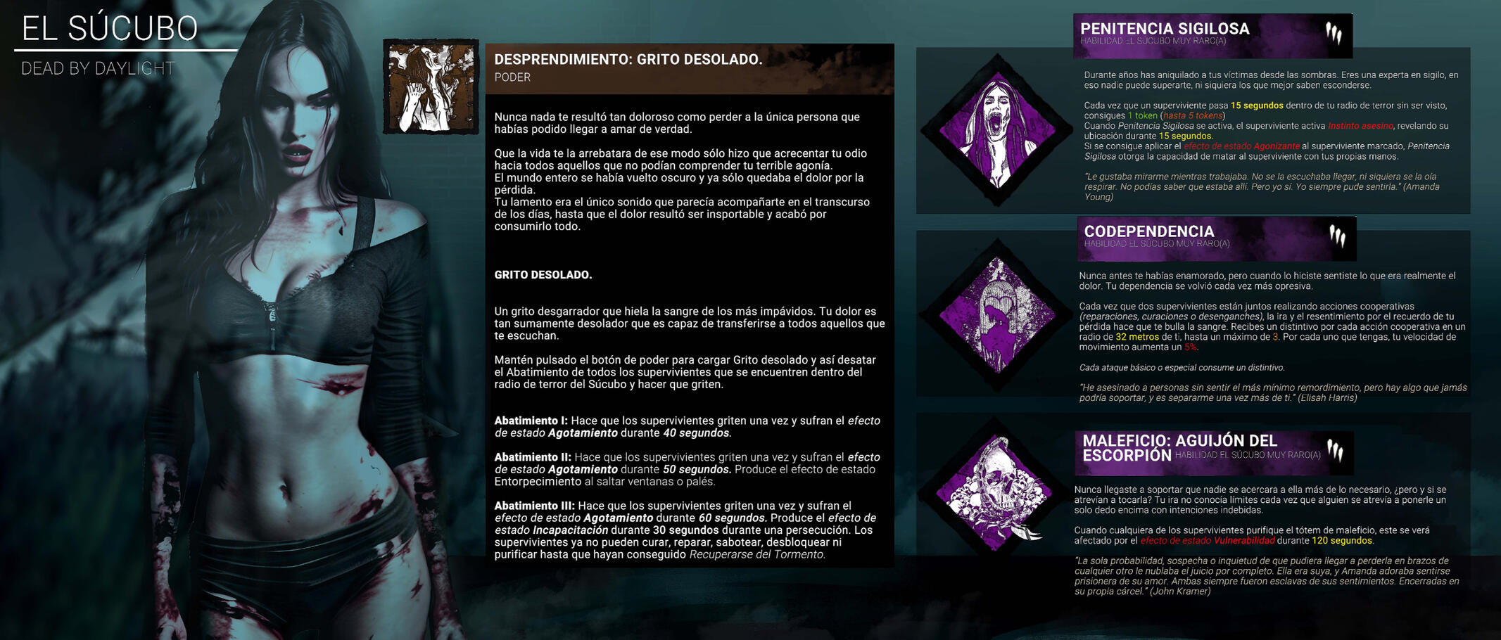 Por supuesto, el Ente, consciente de todas las fechorías que Elisah había cometido, decidió castigar su traición, jugando a su propio favor. Supo que su bando jamás fue el de superviviente, que el lugar que verdaderamente le pertenecía era el de asesino.De ese modo, el Ente desterró a Elisah a un reino exclusivamente concebido para ella. El cementerio de la Desolación y el Tormento, donde debería asesinar a aquellos que un día fueron sus aliados, entregando sus vidas como sacrificio por su eterno castigo.El sufrimiento de no volver a ver a Amanda supuso para Elisah la deconstrucción progresiva de su humanidad. Poco a poco se fue convirtiendo en uno de los asesinos más feroces e impíos de todos los reinos.El amor era uno de los sentimientos más fuertes que el ser humano podía sentir, y cuando se lo arrebatabas, cuando ya no quedaba nada, la atrocidad se abría paso con brutalidad, sembrando masacres.Elisah pasó el resto de sus días lamentándose entre insoportables sollozos por la pérdida de la única persona que la había hecho sentirse viva. Su llanto era tan lacerante, tan desgarrador, que mermaba la esperanza de todos aquellos que estuvieran asediados.Elisah perdió el último resquicio de humanidad que le quedaba. Ahora era un monstruo sediento de sangre buscando en las muertes ajenas aliviar el sentimiento desesperanzador que la pérdida de Amanda había traído consigo.Ahora vagaba entre lamentos esperando alimentarse del alma de aquellos que se atrevieran a atravesar las puertas de su reino, los cuales correrían un funesto destino.Su habilidades personales Penitencia sigilosa, Codependencia y Maleficio: Aguijón del escorpión le proporcionan la capacidad de localizar a supervivientes y desencadenar efectos letales sobre ellos.